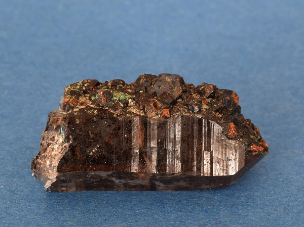 Cafarsite crystals on smoky quartz. The cafarsite is partially altered to