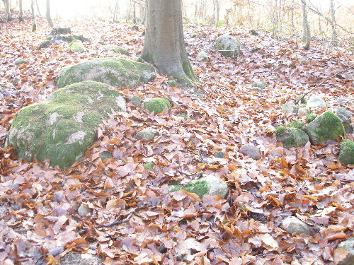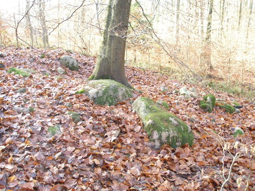 Am Rand einer Hügelkuppe finden sich zwei große und zahlreiche etwa kopfgroße Steine. In den beiden großen