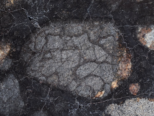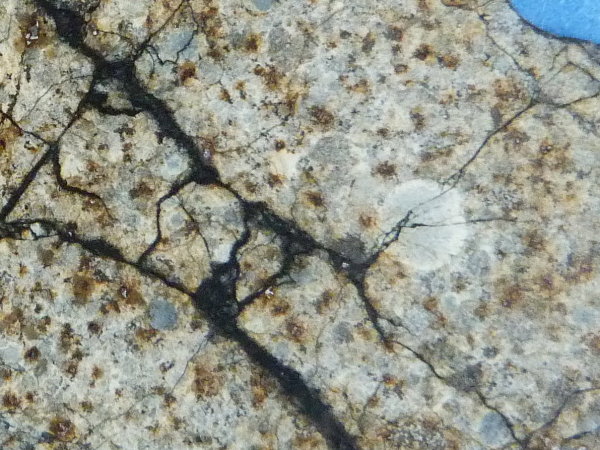 NWA 12520. Brekziierter Klast in Impaktschmelz-Matrix. Bildbreite 28 mm. Sammlung und Foto Thomas Witzke.