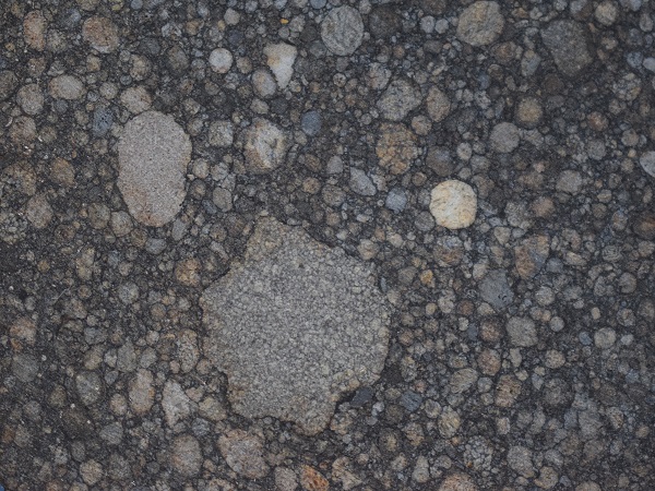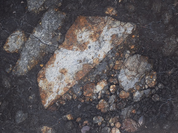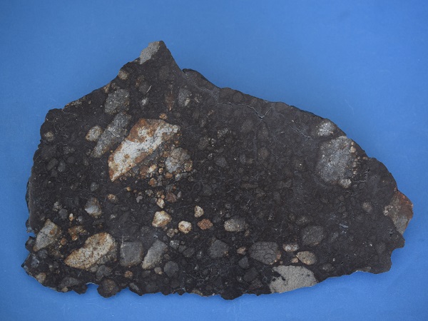 NWA 12520. Klasten in Impaktschmelz-Matrix. Der große Klast im Zentrum zeigt noch reliktische Chondren. Bildbreite 80 mm. Sammlung und Foto Thomas Witzke.
