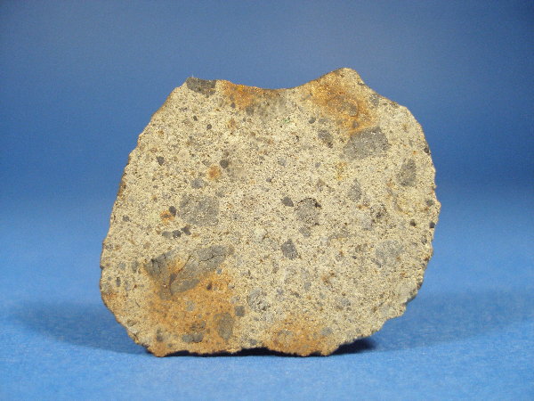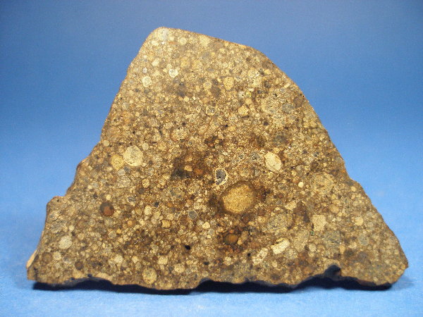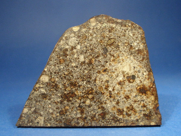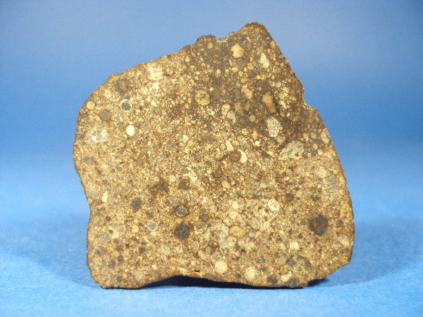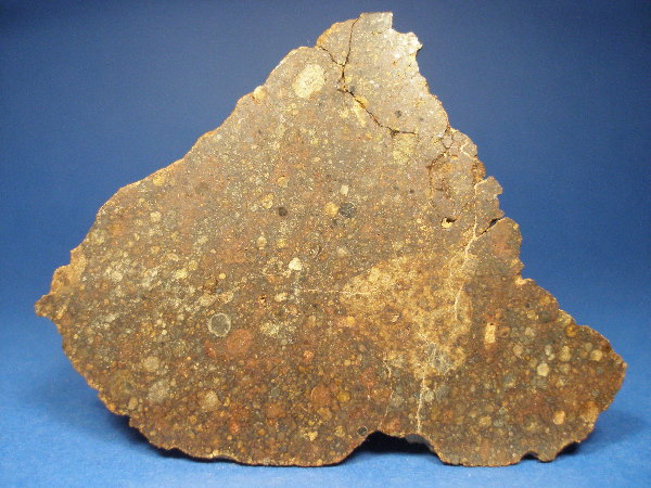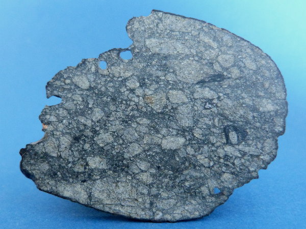 Der Meteorit enthält Forsterit (Fa27.7) und Pyroxen (Fs23.4Wo1.7). In der hier vorliegenden Scheibe ist ein 30 mm großer, runder, Mg-Ca-reicher Einschluss zu sehen. Es handelt sich um eine extrem große Chondre. Gut erkennbar sind bis zu 3 mm lange Pyroxen-Kristalle in der Chondre. Schockstadium S2, Verwitterungsgrad W2.