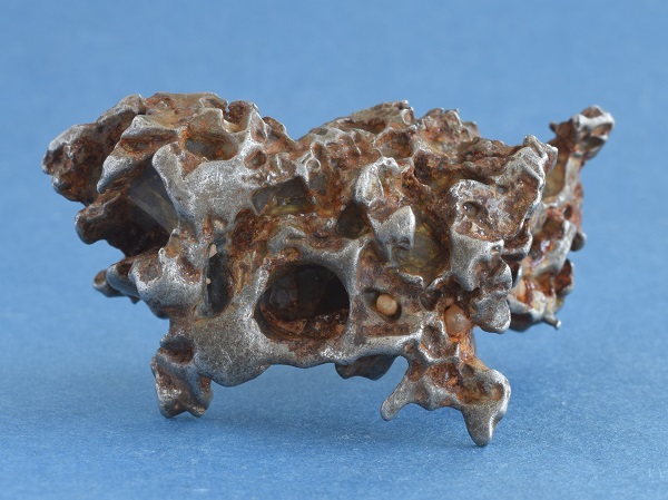 1 cm große, gerundete Olivine in einer Metall-Matrix auf. Bei dem Olivin handelt es sich um Forsterit (Fa21.2).