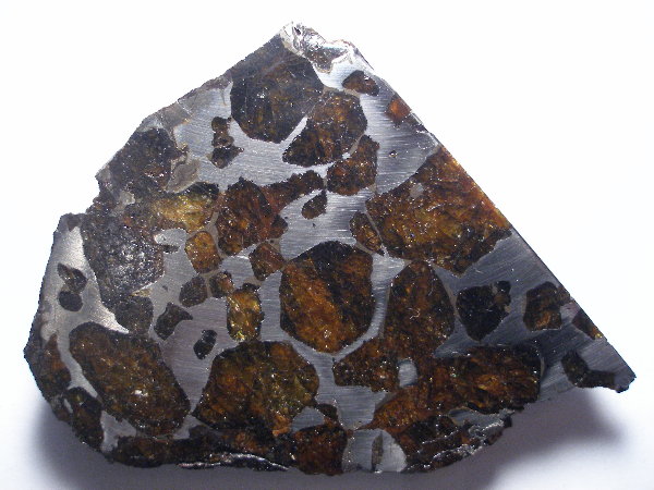 Pallasite weisen Silikat-Einschlüsse, meist große Olivin-Kristalle, in einer Ni-Fe-Metall-Matrix auf.