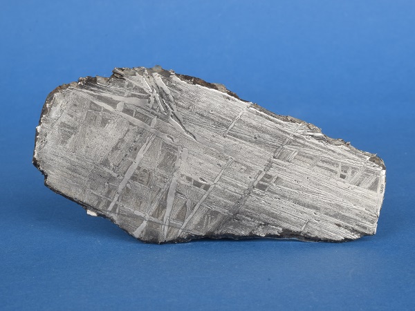 Die Scheibe zeigt Widmannstättensche Figuren mit deutlichen Deformationserscheinungen. Zu erkennen ist