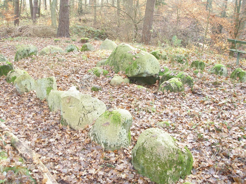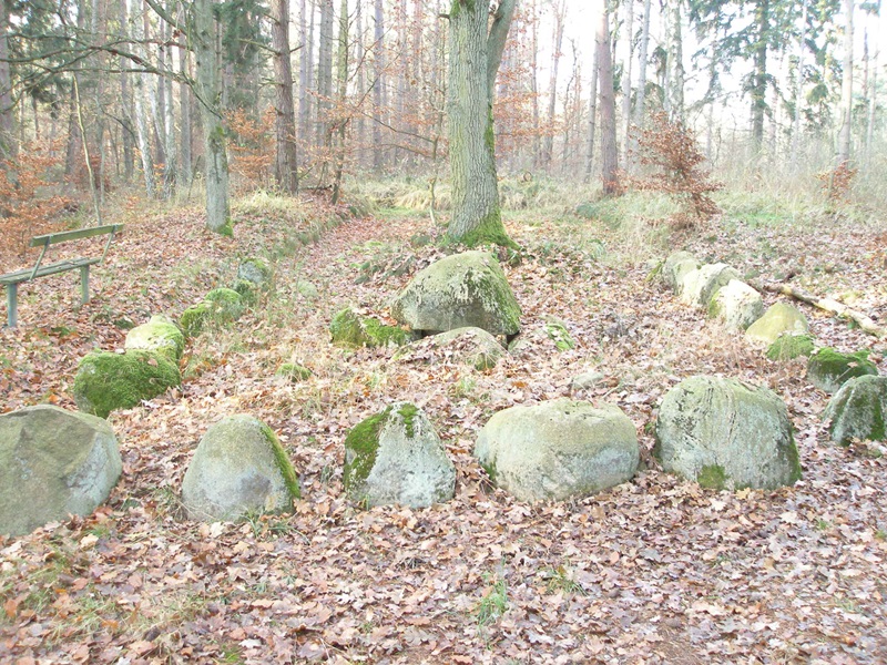der letzten Häuser im Wald liegt das Großsteingrab links vom Weg.