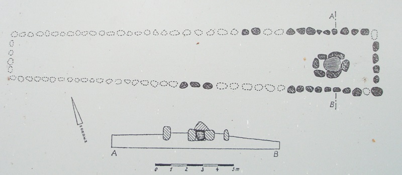 orientiertes, etwa 29 Meter langes Hünenbett mit einem Urdolmen. Das Hünenbett, von dem