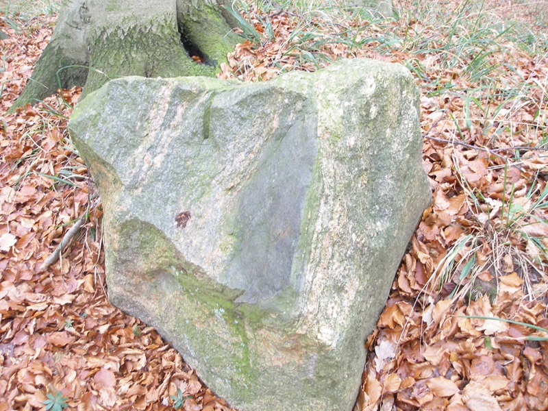 zerstört. Man erkennt noch einen größeren Stein, der ein Bohrloch aufweist und von dem bereits