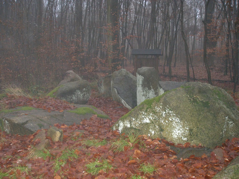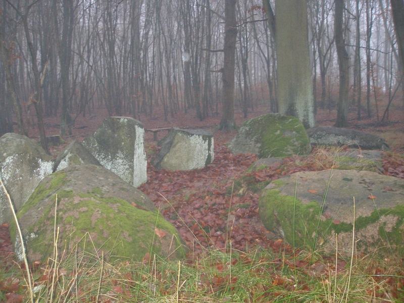 parken. Man folgt dem Weg in den Wald bis zu einer Wegekreuzung, hier sind die Großsteingräber