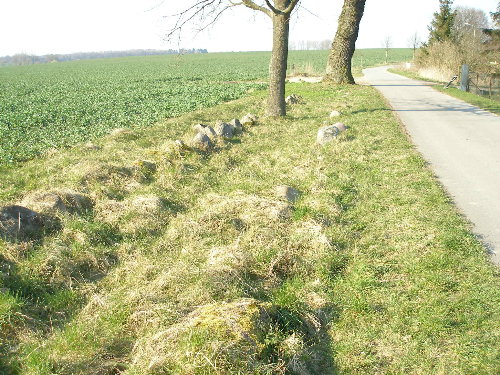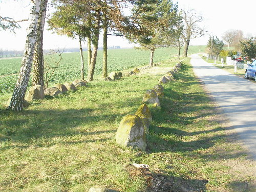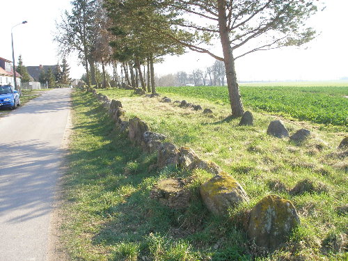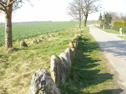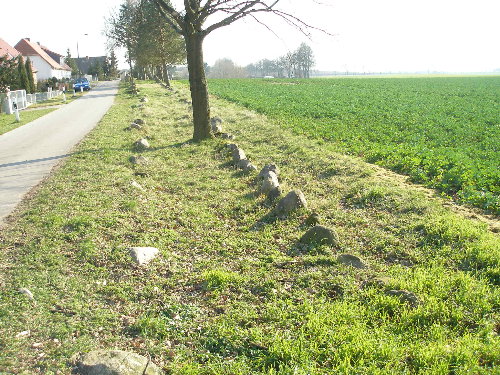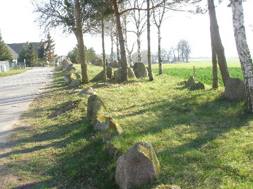 Großsteingrab "Zülow (Stralendorf)", Zülow, Stralendorf bei Schwerin Sprockhoff: Nr. 403. Das Grab liegt am westlichen Rand von Stralendorf, südwestlich von Schwerin. Von der durch Stralendorf führenden Straße biegt man in den Gartenweg ab und gelangt so direkt zu der Anlage. Bei Sprockhoff läuft das Grab unter dem Namen Zülow, es liegt jedoch in Stralendorf (zumindest nach den heutigen Grenzen). Unverständlich ist, wieso es zu dieser schönen und beeindruckenden Anlage weder ein Hinweisschild noch eine Informationstafel gibt (Stand 2007). Es handelt sich um eine der längsten Anlagen Deutschlands. Das trapezförmige Hünenbett ist in Nord-Süd-Richtung orientiert. Von etwa 4 Metern im Süden veringert sich die Breite auf etwa 1,5 Meter im Norden bei einer Länge von 125 Metern. Die Steine werden nach Norden zu immer kleiner. Bei Sprockhoffs Aufnahme 1934 war der Erddamm noch weitgehend erhalten und nur ein Teil der Steine des Hünenbetts zu sehen. 1964 wurde das Grab durch E. Schuldt ausgegraben. Dabei stellte sich heraus, dass es nahezu komplett erhalten ist. Zwei Steine, die wie eine Unterteilung des Hünenbetts aussehen, sind offenbar nur verlagert, da sich an dieser Stelle in der Umfassung eine Lücke befindet. Eine Kammer ist wohl nicht vorhanden gewesen. Koordinaten (GPS gemessen): 53.57539° N, 11.28880° E (WGS84).